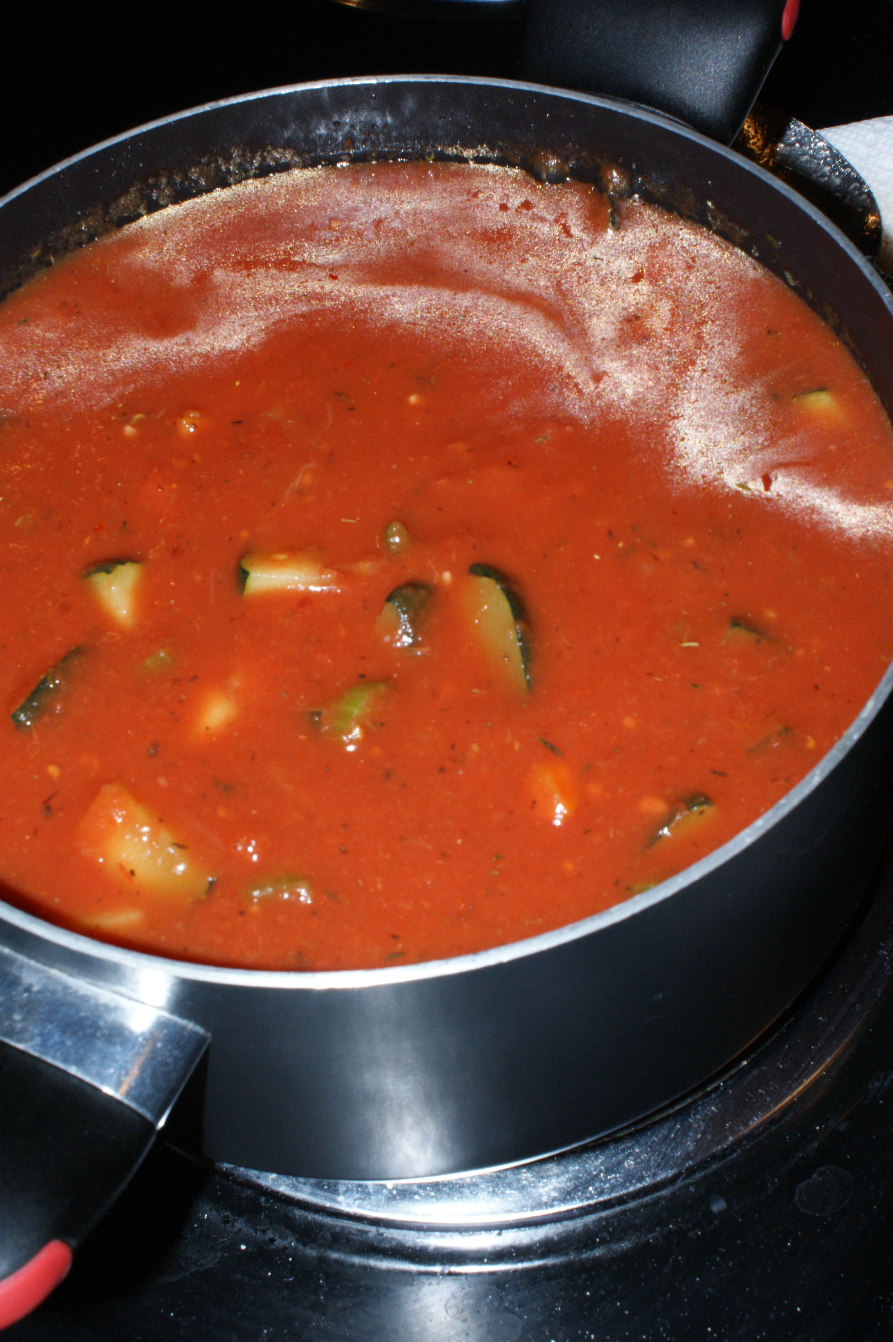 You start out by cutting up your vegetables. Once they’re mixed together, you throw them in a pot with some olive oil and garlic. You let that cook for a while, then add your spices.
