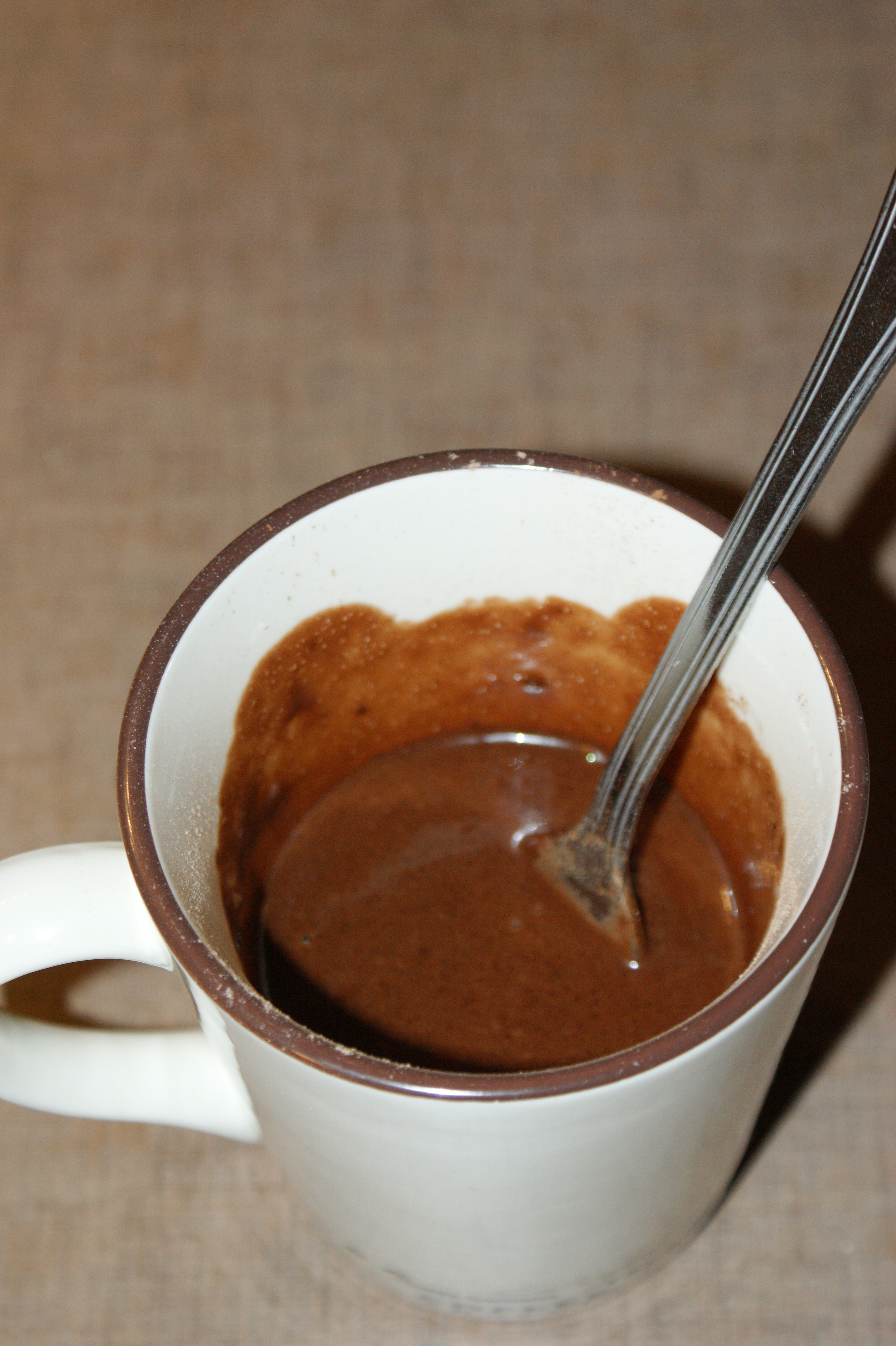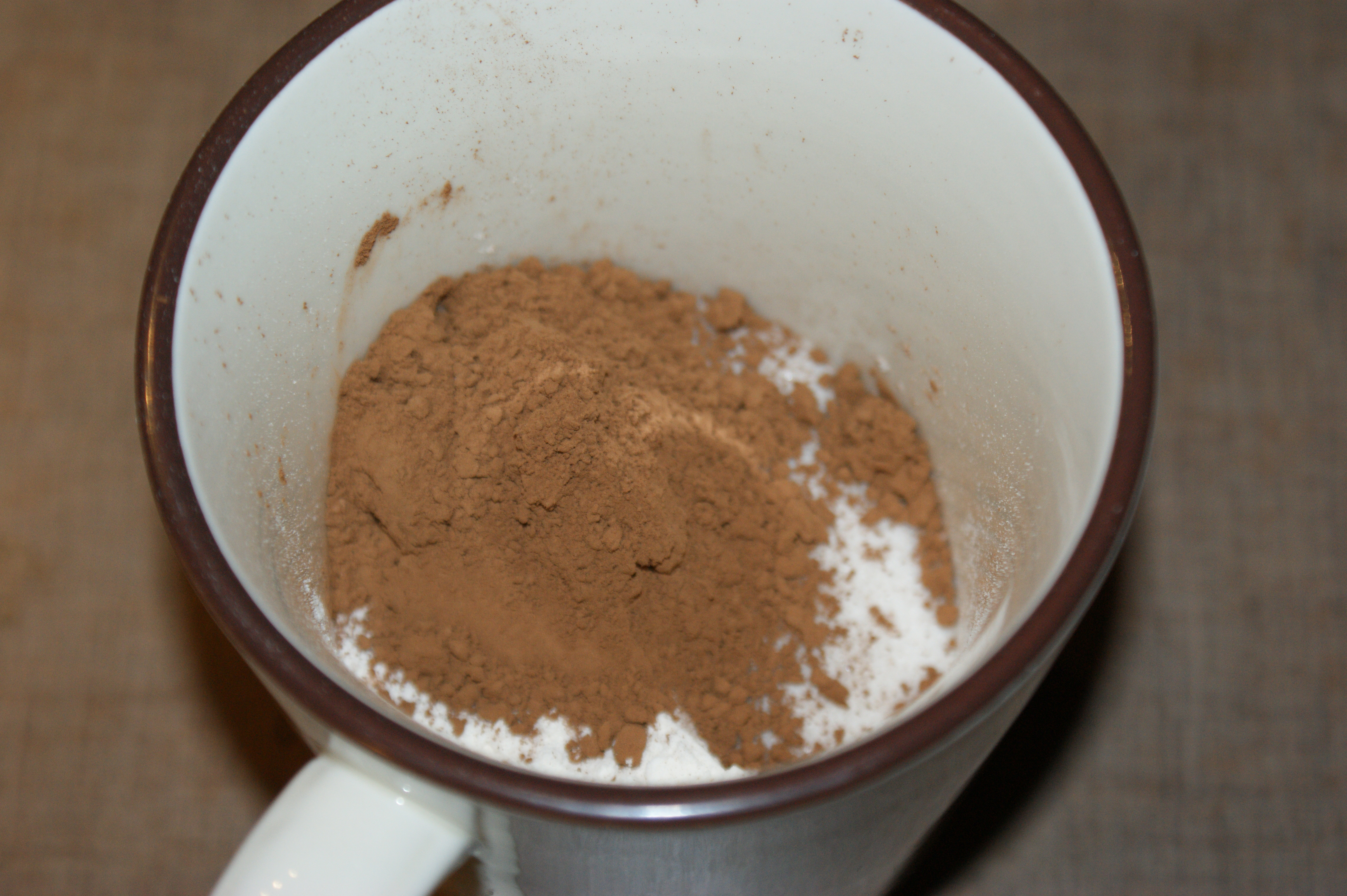 You start by mixing your dry ingredients in the mug – nothing major, just some flour, sugar, cocoa powder, salt and cinnamon. After that come your wet ingredients, and then you mix it all up and throw it in the microwave.