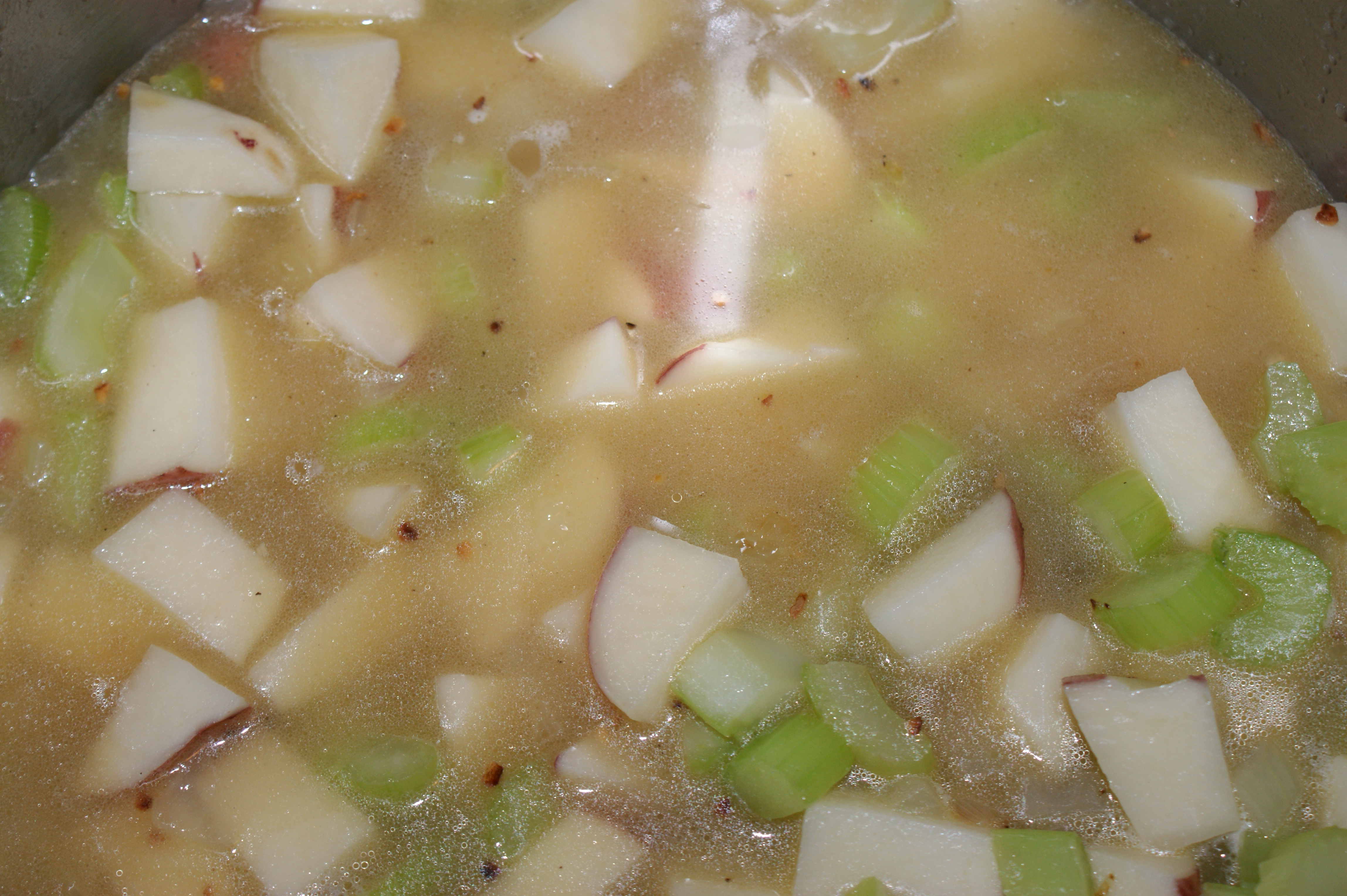 This soup turned out wonderfully, and it was pretty simple to make. You start out by sauteing some onion, celery and garlic, and then you add in the potato and chicken broth (or vegetable broth, if you want a meat-product-free dish). Then you just let it boil until everything’s nice and soft.