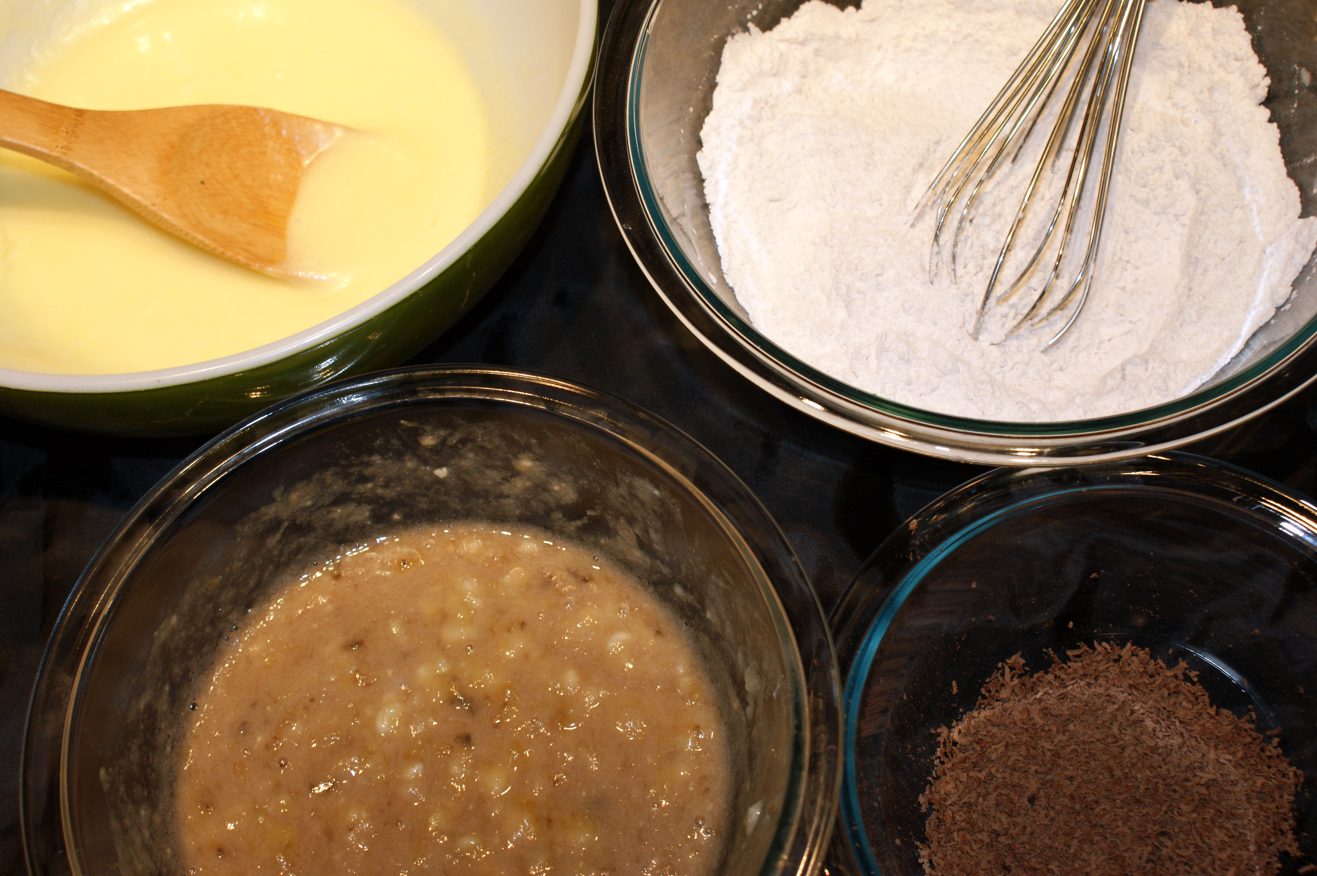 - In a second, smaller bowl, whisk together all of the dry ingredients, including the chocolate.