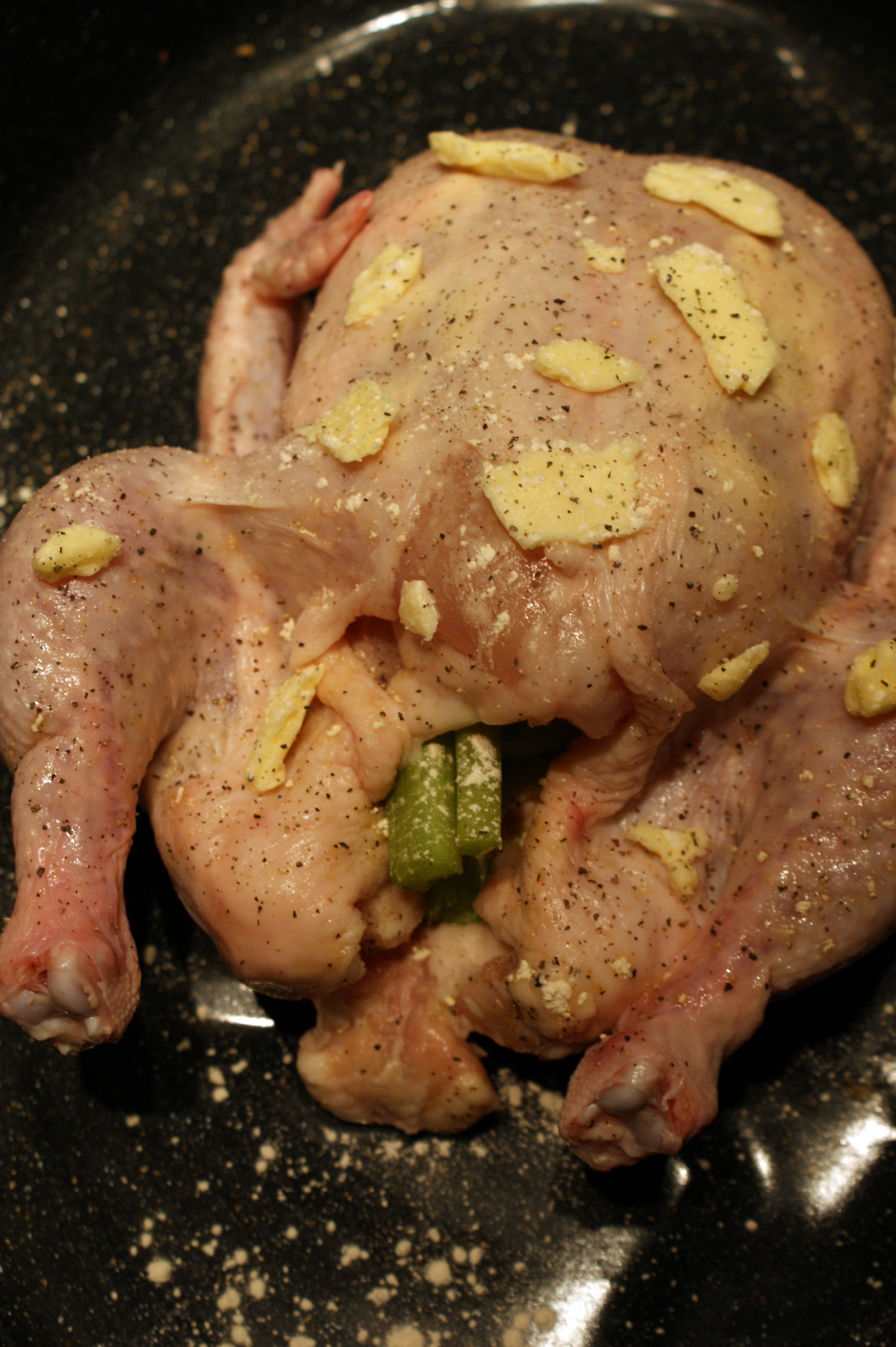 - Sprinkle a little bit of salt, pepper and garlic powder inside the chicken. Cut the celery stalk into three or four pieces and insert it into the chicken. Add a few small pieces of butter, as well.