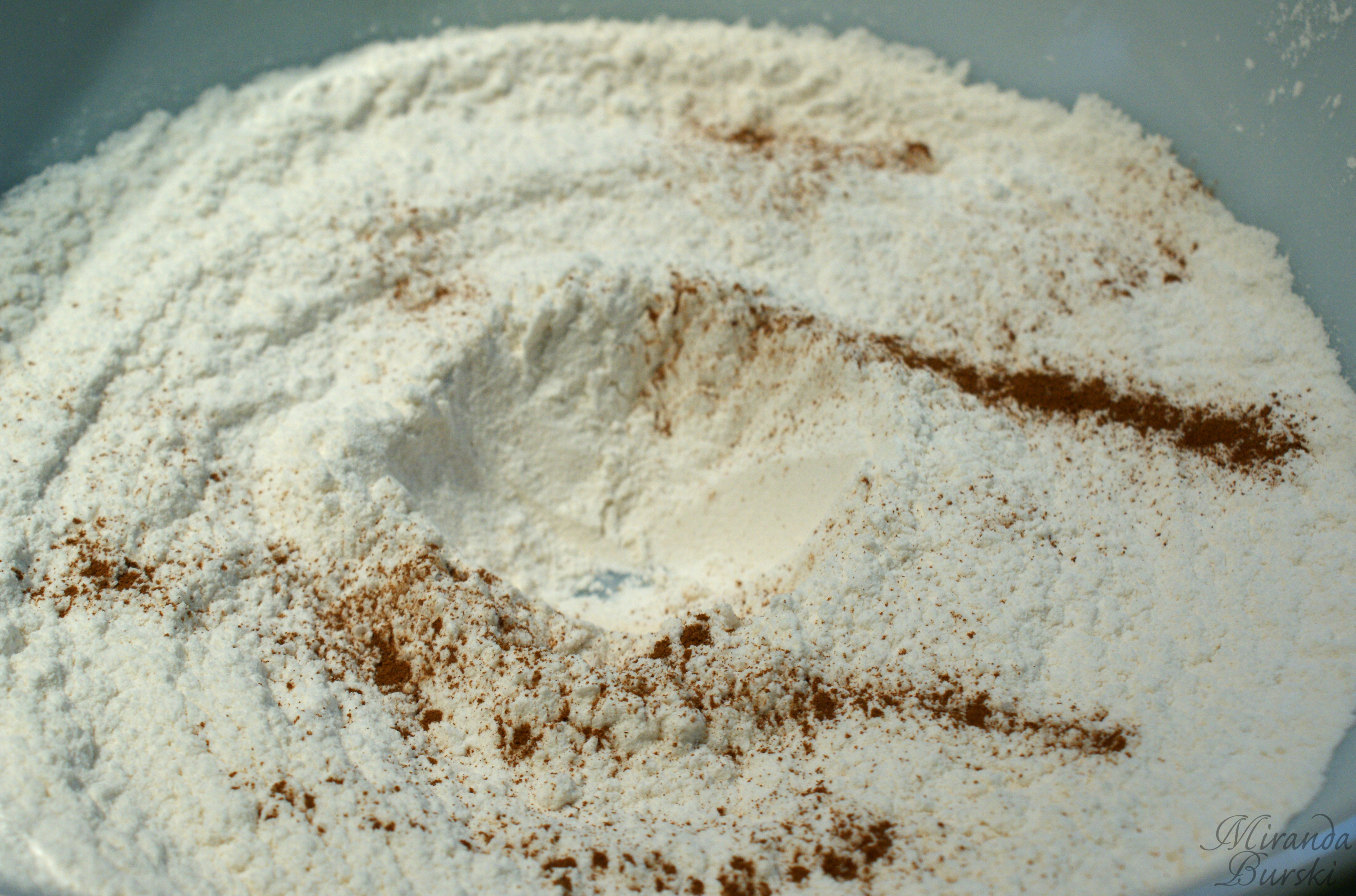 - In a large bowl, whisk together the flour, baking powder, salt and cinnamon. Make a well in the centre and set aside.
