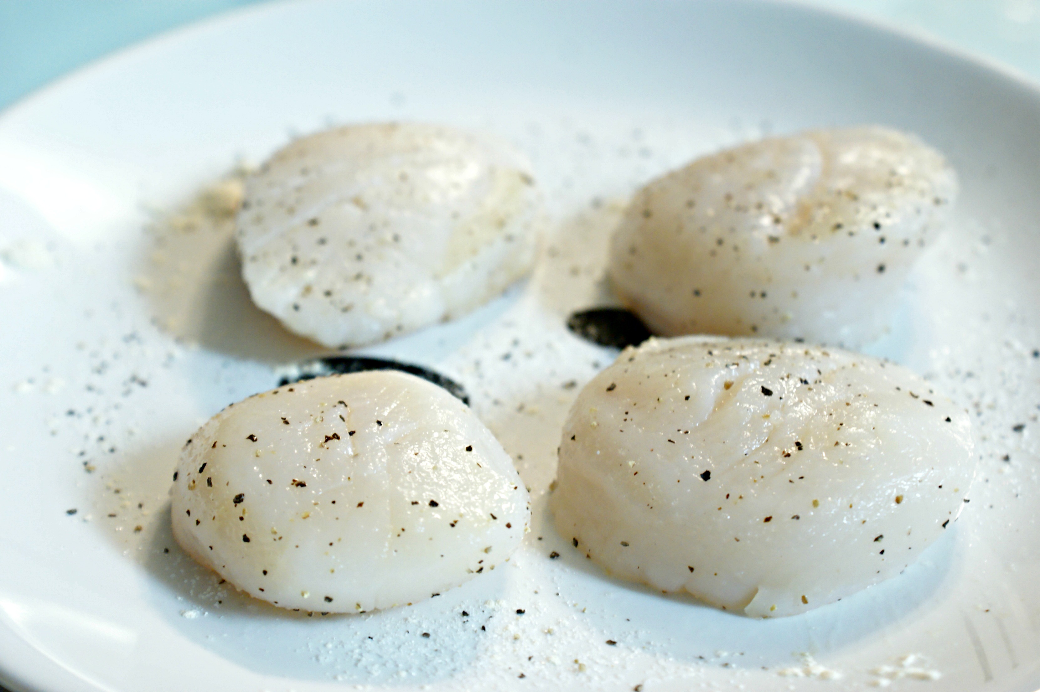 After checking out my seasoning collection, I decided that the simple combination of salt, pepper, and garlic would be the way to start. I didn’t want anything that would overpower the flavour of the scallops themselves, but I did want to add a little something to them. I also wavered between searing the scallops in butter or olive oil — both were used in the recipes I looked at online, and I knew that both would do a good job of complementing the scallops and seasoning.
