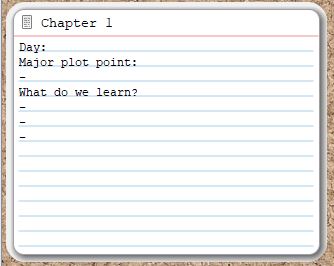 For me, this means including the chapter title at the very top of the card, and then a date, year, or setting as a marker on the next line. After that, I answer two questions per card: